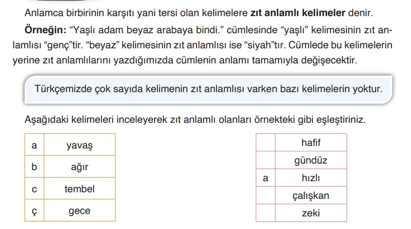 Zıt anlamlı kelimeler nelerdir? Anlamca birbirinin karşıtı yani tersi olan kelimelere zıt anlamlı kelimeler denir. Örneğin: “Yaşlı adam beyaz arabaya bindi.” cümlesinde “yaşlı” kelimesinin zıt anlamlısı “genç”tir. “beyaz” kelimesinin zıt anlamlısı ise “siyah”tır. Cümlede...